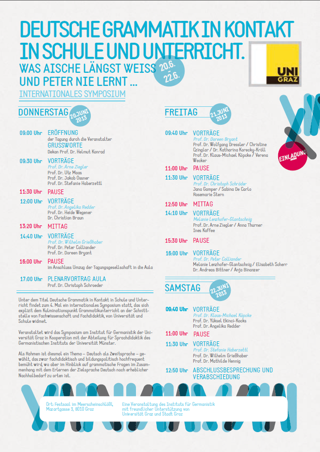 Unter dem Titel Deutsche Grammatik in Kontakt in Schule und Unterricht findet zum 4. Mal ein internationales Symposium statt, das sich explizit dem Kulminationspunkt Grammatikunterricht an der Schnittstelle von Fachwissenschaft und Fachdidaktik, von Universität und Schule widmet. Veranstaltet wird das Symposium am Institut für Germanistik der Universität Graz in Kooperation mit der Abteilung für Sprachdidaktik des Germanistischen Instituts der Universität Münster. Als Rahmenthema ist diesmal ein Thema gewählt, das zwar fachdidaktisch und bildungspolitisch hochfrequent bemüht wird, wo wir aber im Hinblick auf grammatische Fragen im Zusammenhang mit dem Erlernen der Zielsprache Deutsch noch erheblichen Nachholbedarf orten – Deutsch als Zweitsprache.