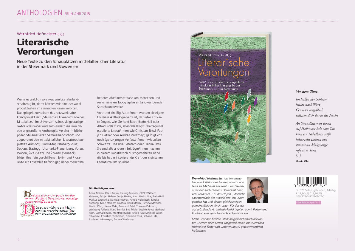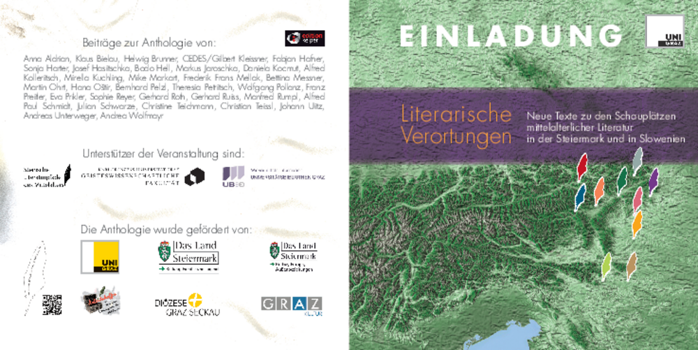 Am 30. April 2015 wird um 18 Uhr im Großen Lesesaal der Universitätsbibliothek Graz in festlichem Rahmen der Anthologieband Literarische Verortungen. Neue Texte zu den Schauplätzen mittelalterlicher Literatur in der Steiermark und in Slowenien präsentiert. Um das Erscheinen dieses vom Literaturpfadeverein initiierten und tragend mitfinanzierten Sammelbandes angemessen feiern zu können, wird alle Gäste bei freiem Eintritt ein vielfältiges Programm erwarten: live-Musik, Lesekostproben zu sämtlichen Literaturschauplätzen und schließlich ein mittelalterliches Degustationsbuffet!