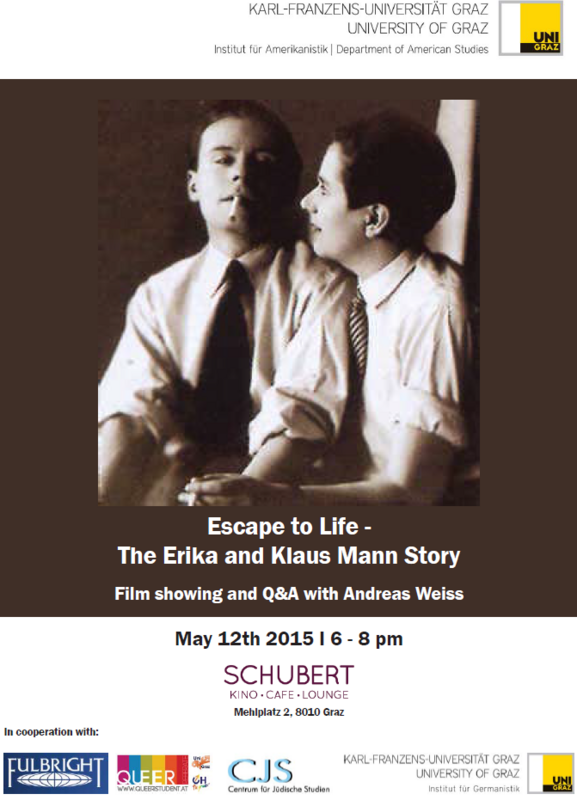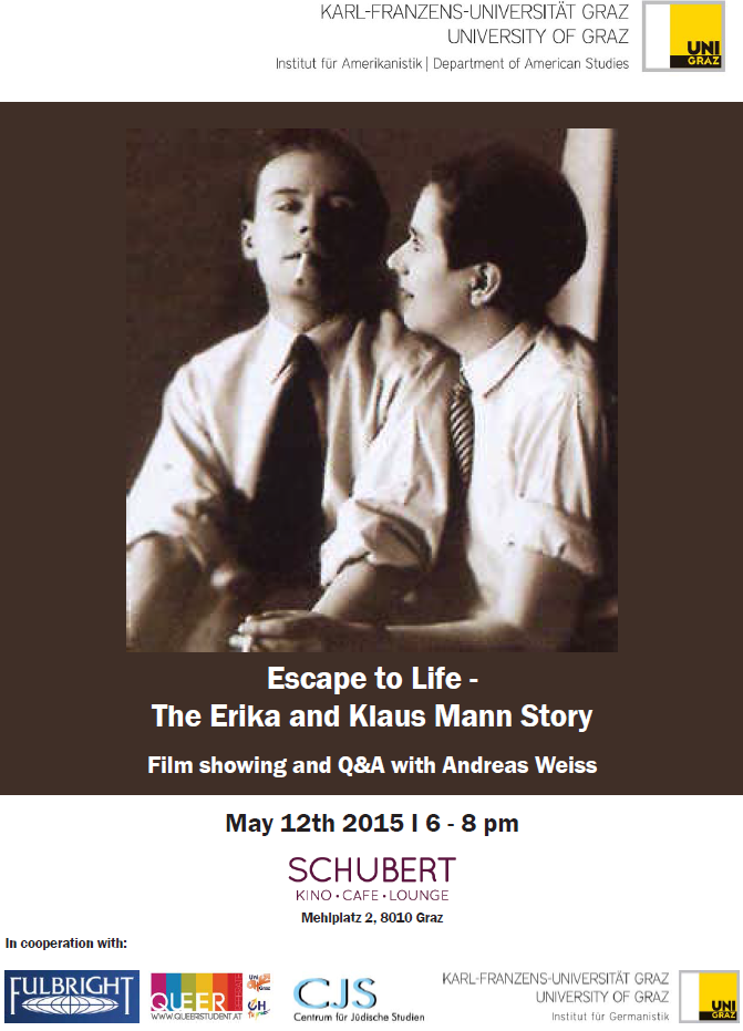 Am 12. Mai 2015 wird im Schubertkino der Film "Escape to Life - The Erika and Klaus Mann Story" präsentiert. Die Regisseurin Andrea Weiss wird danach Fragen und Antworten zum Film und zum Leben der beiden Kinder von Thomas Mann beantworten. Das Institut für Germanistik ist Co-Veranstalter dieser Filmpräsentation und lädt hiermit alle Interessierten ein, daran teilzunehmen.