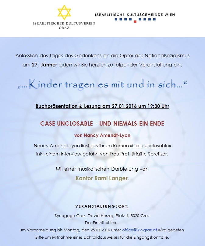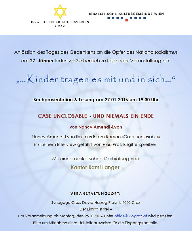 Buchpräsentation und Lesung am 27.01.2016 um 19:30 Uhr. (Synagoge Graz, David-Herzog-Platz 1, 8020 Graz)